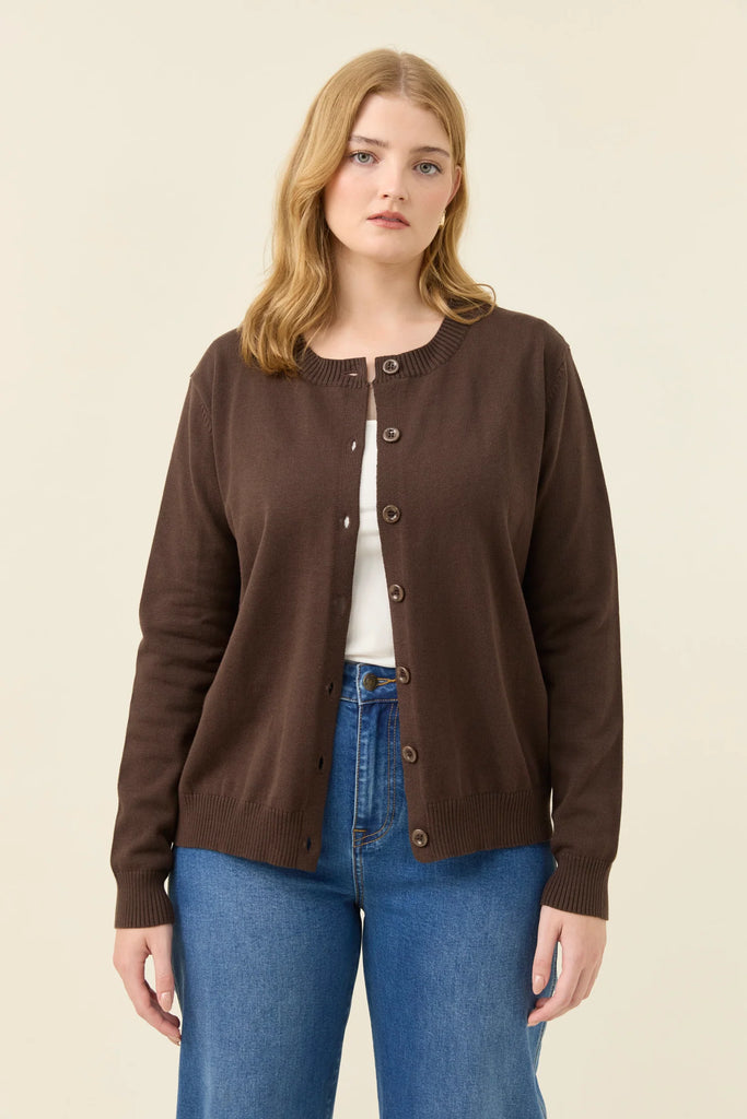 A lightweight cotton-blend knit cardigan with a soft, easy drape. The button-down front keeps the look simple and versatile, while ribbing at the hip and sleeves adds gentle structure to the silhouette.