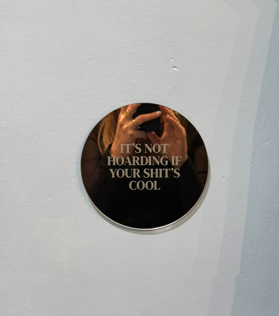 Because honestly… if your things are cool, it’s called curating, not hoarding. This round (15cm) mirror features the hilarious quote “It’s not hoarding if your shit’s cool” a fun addition to any wall or shelf
