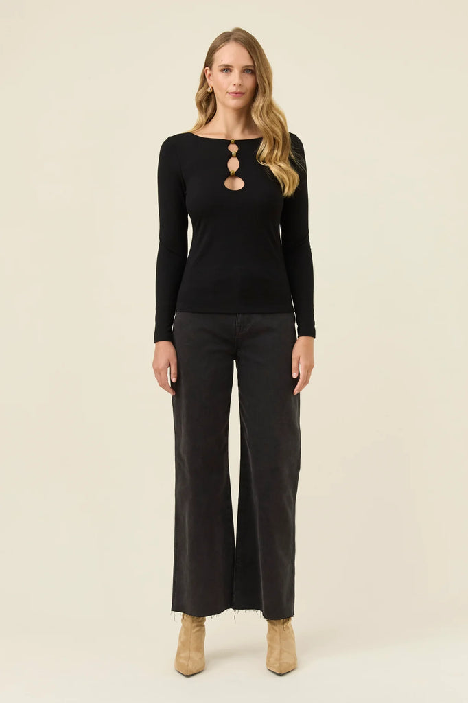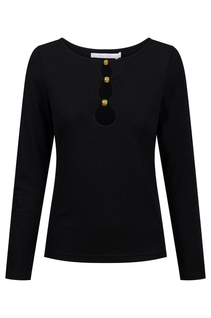 A soft, mid-weight jersey top with a clean, elevated twist. The stretch fabric creates a smooth line through the body, while the front cut-outs and trio of beads bring a subtle statement detail.