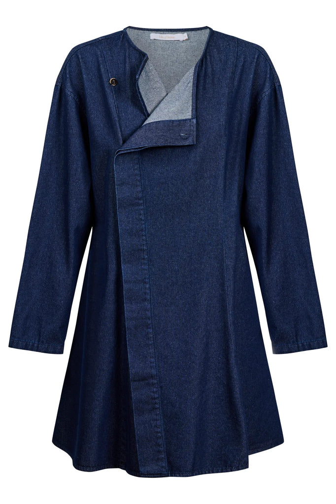 A versatile denim piece that works as a top, dress or lightweight jacket. The round neckline and hidden button placket keep the shape clean, while internal pockets add easy practicality. Cut from soft cotton denim with a relaxed, transitional feel.